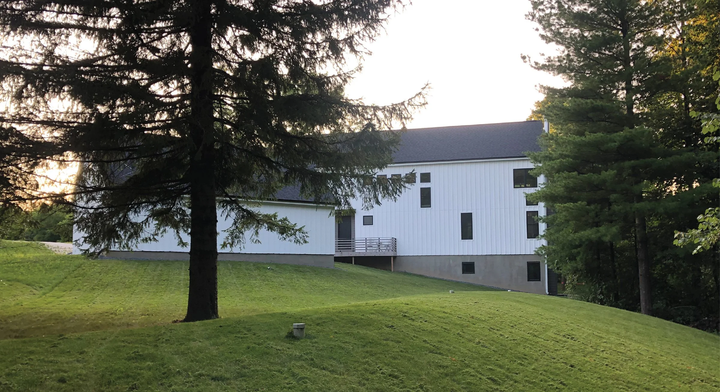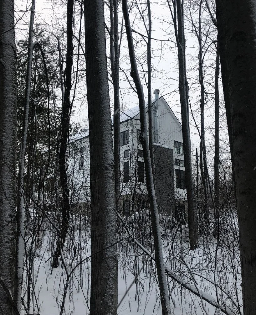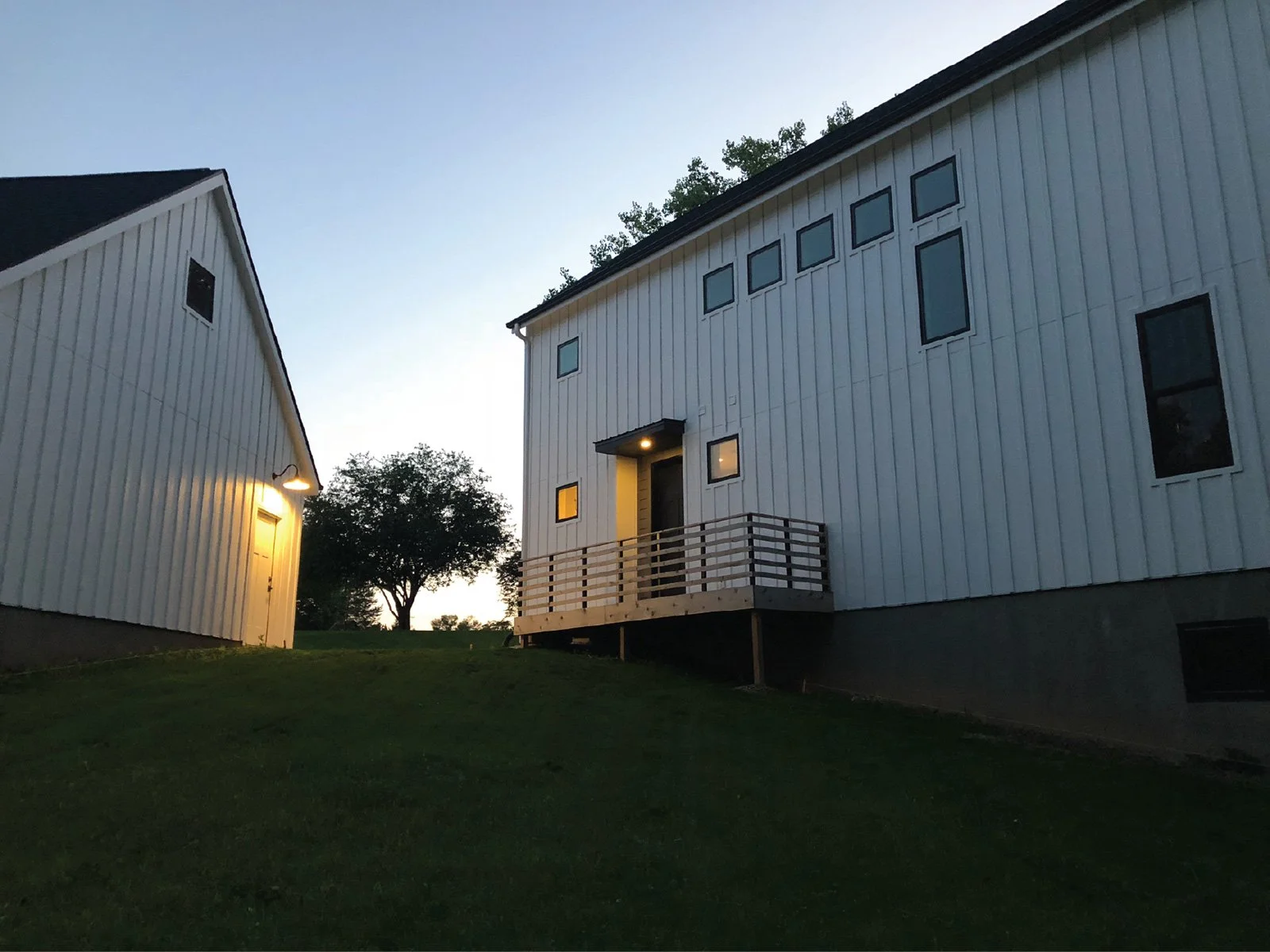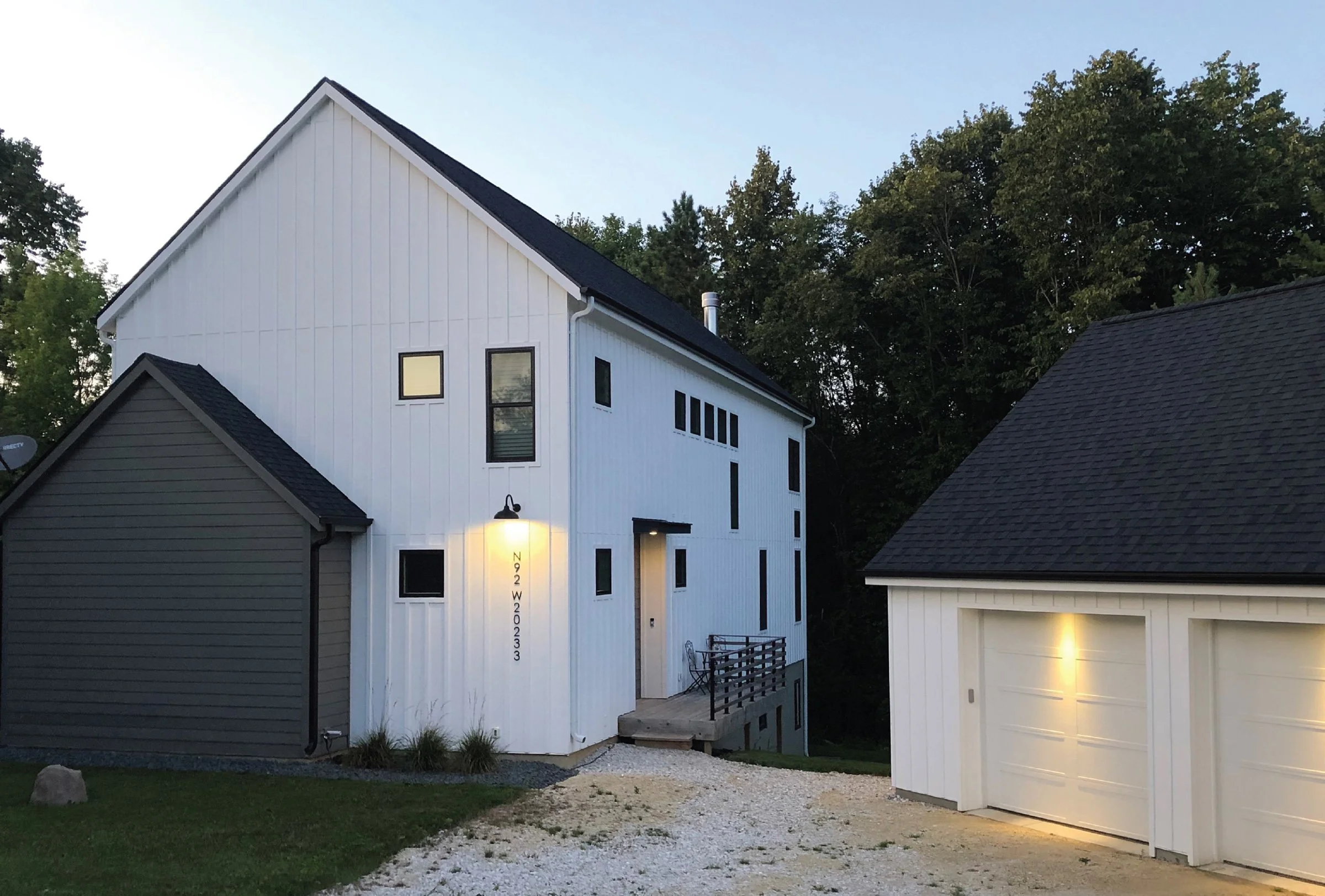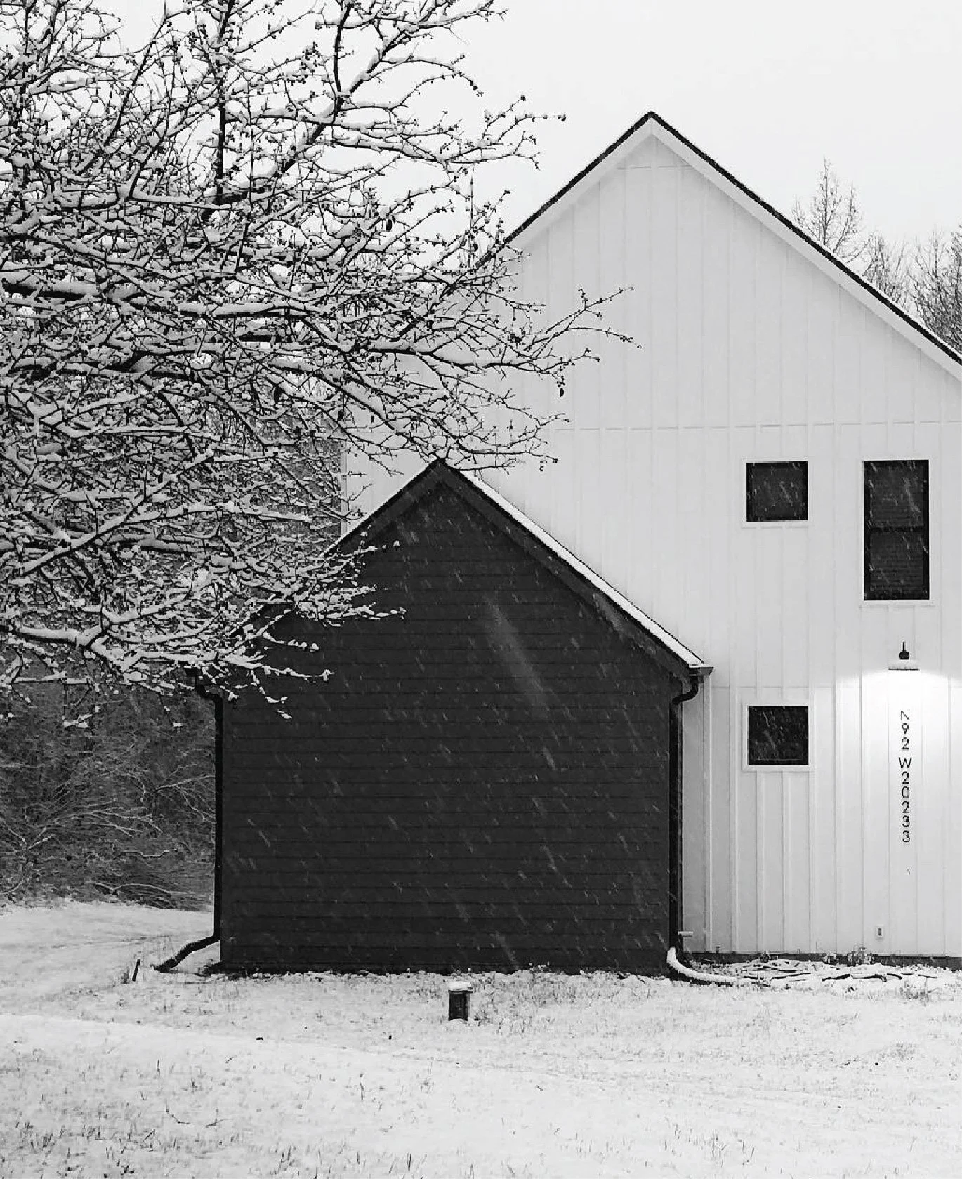 A modern contextual approach to the historic barns of rural Wisconsin, the simple forms and simple materials of this home work with the sloping landscape. Working with the existing grade provided an opportunity to be tucked into the woods and nestle itself into the earth. The proximity of the woods as the house pulls away from the landscape gives an elevated feeling of being encompassed by the trees.